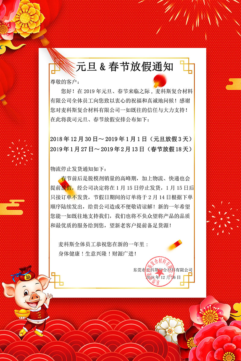 溫馨提示:為確保放假期間您的生產(chǎn)貨源充足,請(qǐng)貴司根據(jù)生產(chǎn)需求提前做好脫模劑備貨準(zhǔn)備,元旦&春節(jié)放假期間我司將不予發(fā)貨和試樣!如有需要,請(qǐng)聯(lián)系您的專(zhuān)屬業(yè)務(wù)員,或垂詢(xún)電話(huà):0769-87788653 或登錄 www.cdzyysg.com查詢(xún),不便之處敬請(qǐng)諒解!